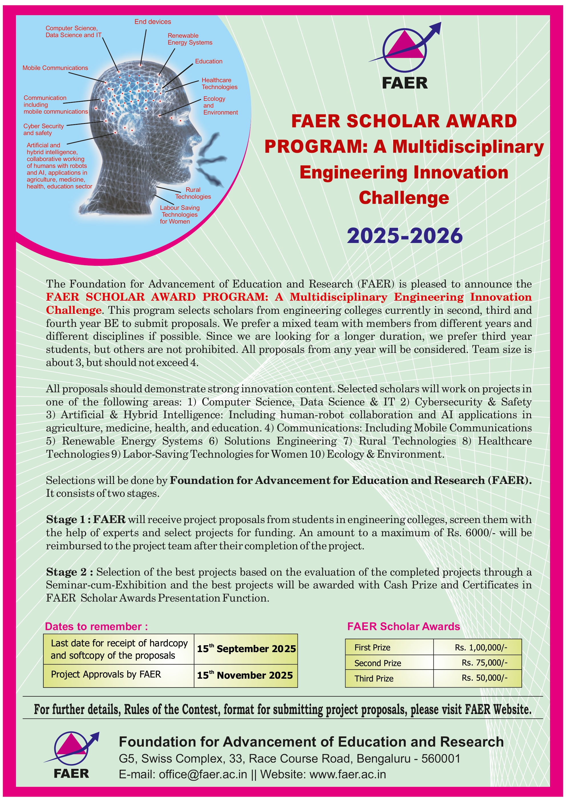 The objective of the FAER scholar program is to encourage creativity and innovation amongst the students in polytechnics and engineering institutions across India particularly those in rural and semi-urban areas making them to think and prepare detailed project proposals on areas and topics of relevance related to rural areas, rural communications, agricultural information systems, e-Governance, resource utilization, ecology, watershed development, renewable resources etc.,Prize Amount